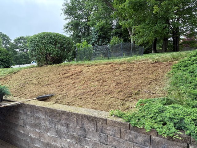 Installed new lawn on hillside, boxwood hedges with river rock.