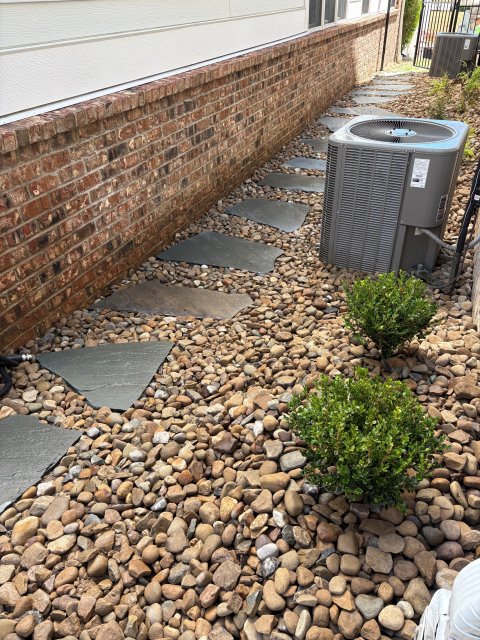Removed existing grass. Installed weed block paper, flag stone pathway and new plants.