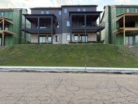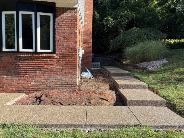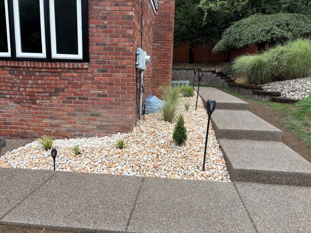 New sidewalk installed by Tavella Concrete. Mangretta Landscaping LLC installed new plantings and new river rock.